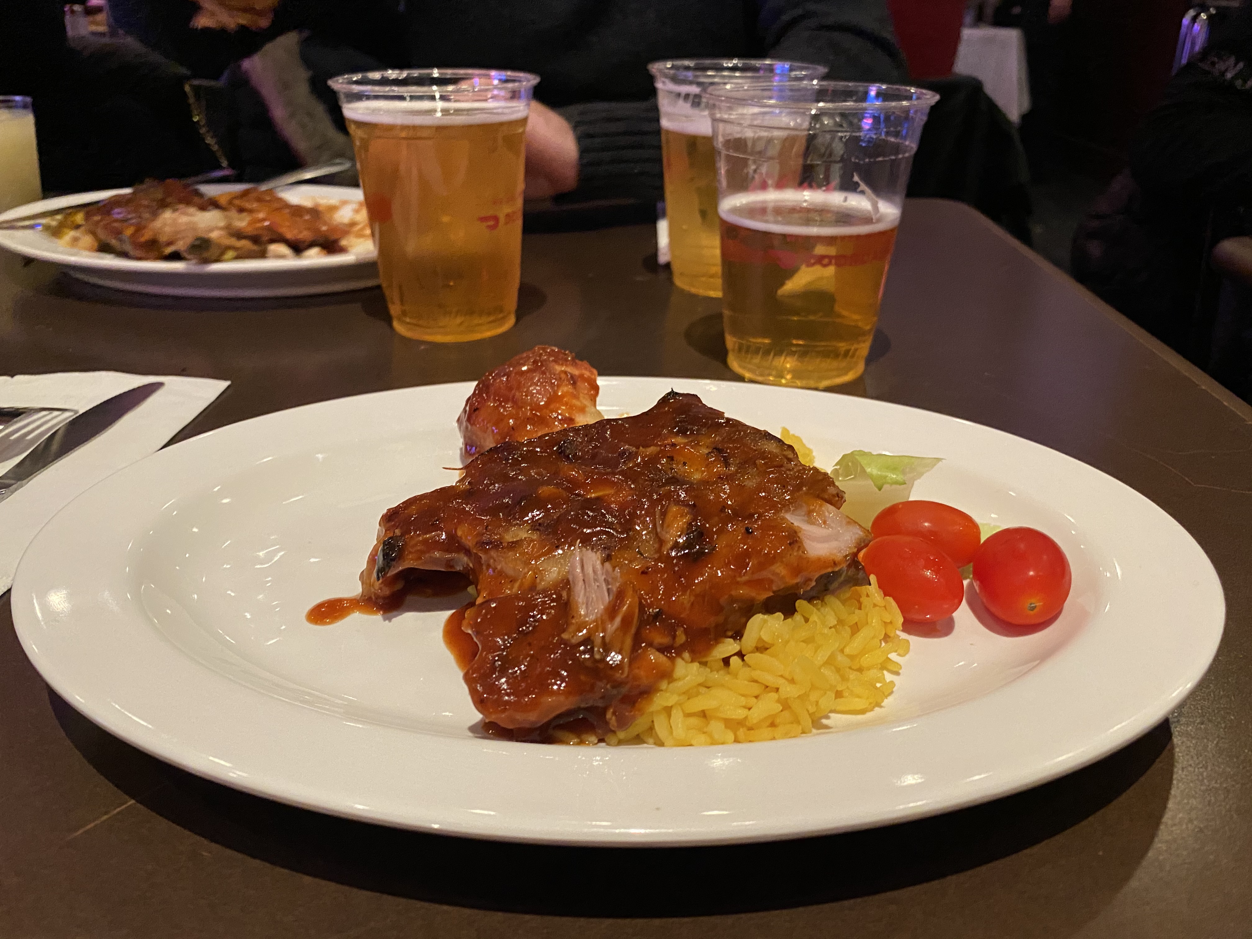 Logo o jantar foi servido e os buffets liberados. Eu achei um jantar muito americano e pesado, mas estava uma delícia: arroz, costela, batata frita e salada.