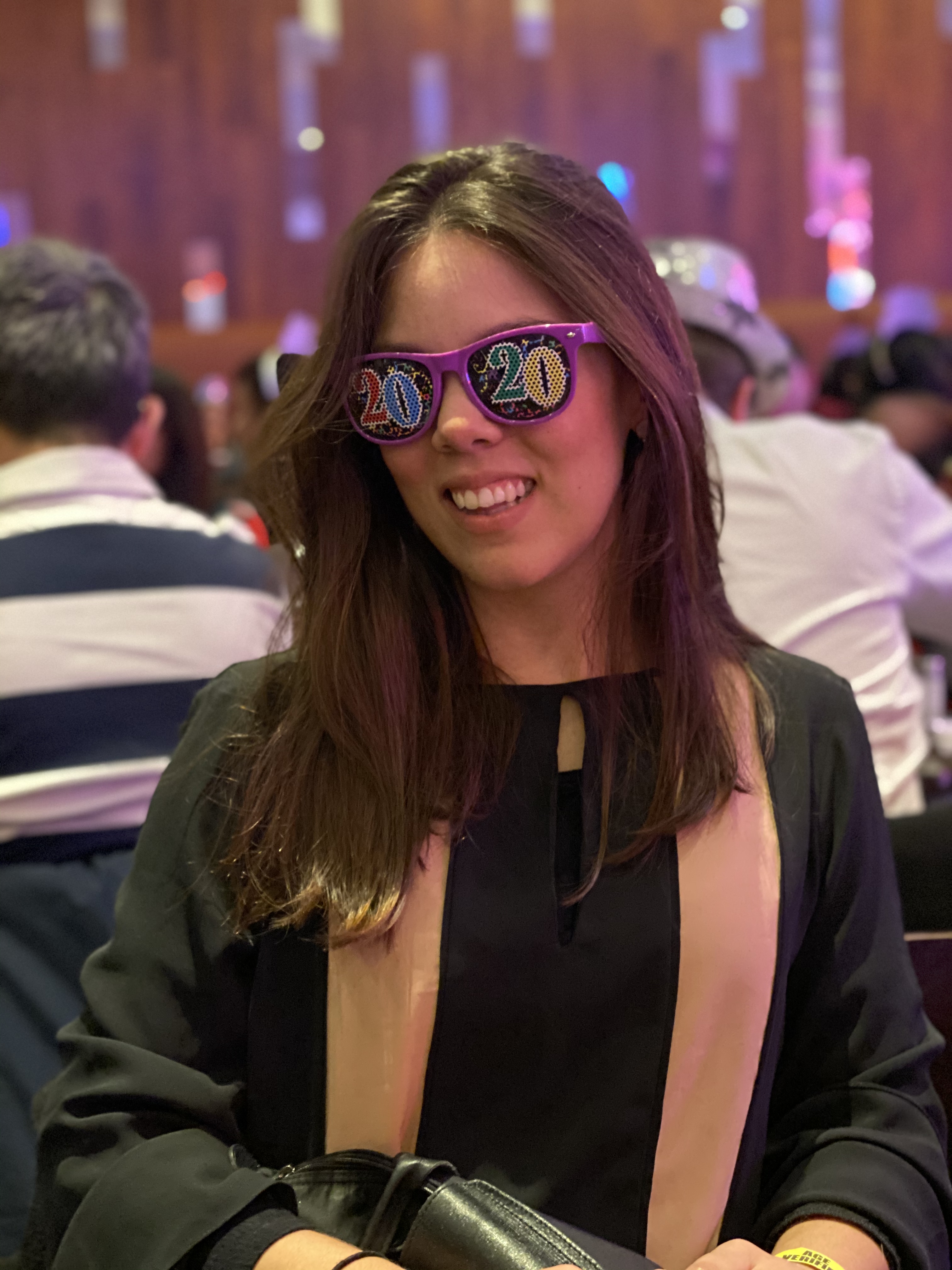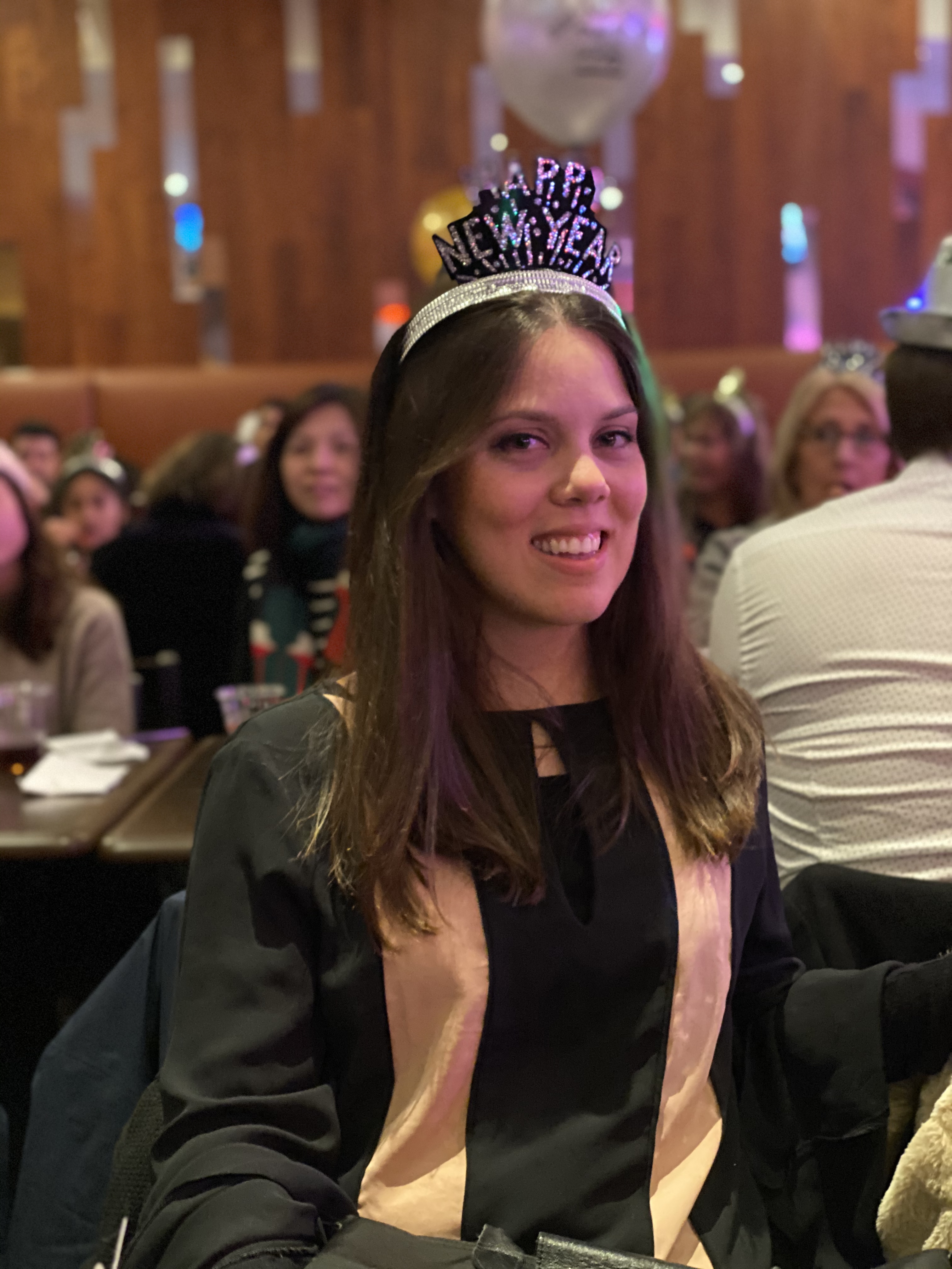 Fomos encaminhados para uma mesa onde havia alguns acessórios de ano novo, como óculos e chapéus, das fotos abaixo. As mesas estavam próximas umas das outras (vida antes da pandemia) e também haviam algumas televisões para acompanhar a virada na Times Square.