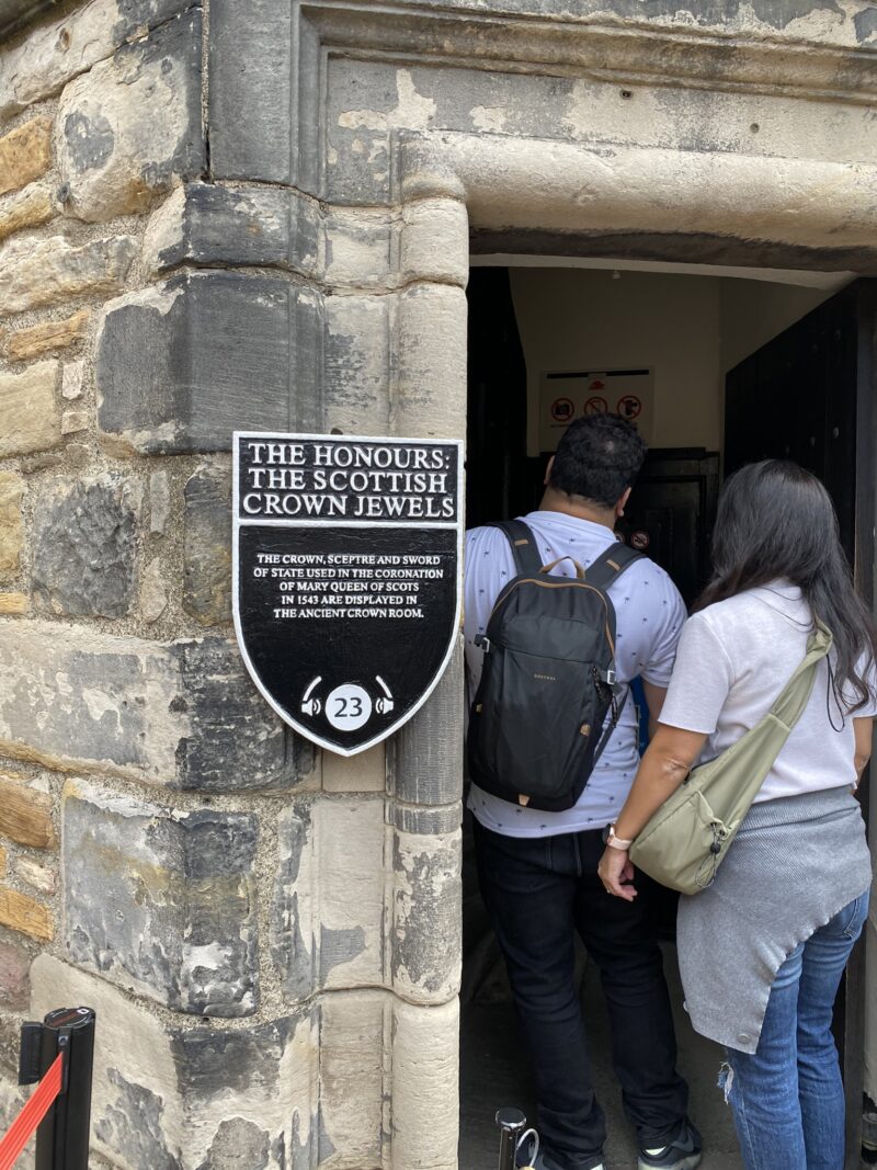 A visita ao Royal Palace começa pela The Honours of Scotland: the Sottish Crown Jewels, que é a sala das joias escocesas. Por isso dividi esse tópico em duas partes. Esta sala é a única parte do castelo onde tinha fila de espera para entrar, ficamos uns 10 minutos na fila.