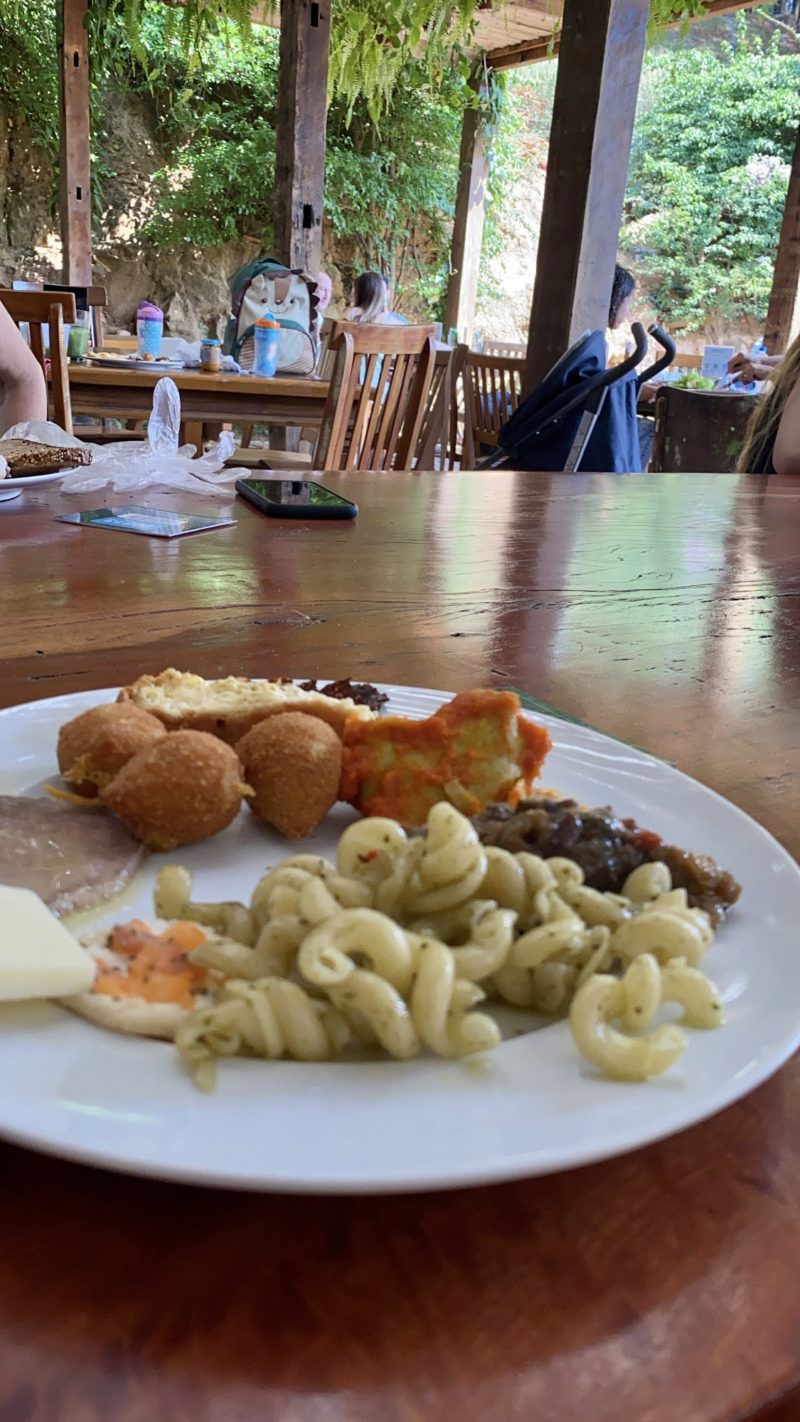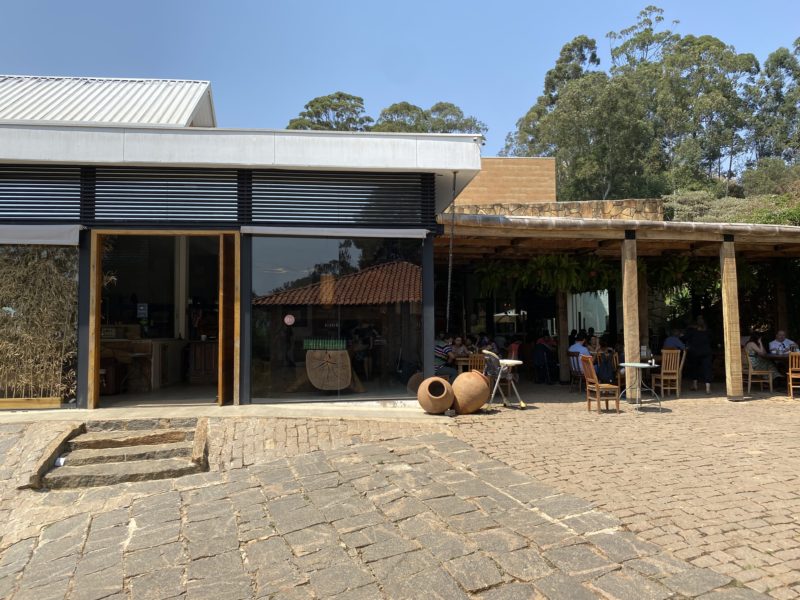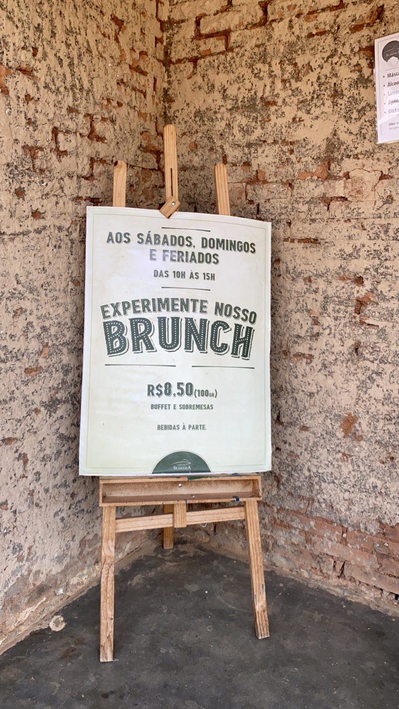Nosso almoço, ou melhor nosso brunch, foi feito na Fazenda no dia da visita. Das 10h às 15h é servido um brunch delicioso na construção em frente à loja, que mais parece uma casinha. Após se servir (utilizando máscara e luvas), um funcionário pesa o seu prato e te entrega uma comanda.