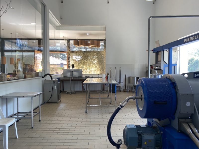Seguindo o passeio, conhecemos as máquinas seguintes, que fazem partes diferentes do processo de produção do azeite: faz uma pasta a partir da azeitona, separa a parte sólida da parte líquida, separa o azeite da água. Em uma outra sala, que é mais gelada, ficam os tanques de armazenamento e na sala seguinte é onde o azeite vai ser envasado. Assim, é retirado o azeite do tanque específico e adicionado o óleo essencial: limão siciliano, alho, refogado, manjericão e alecrim.