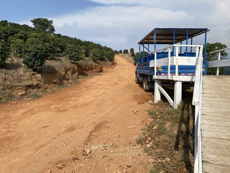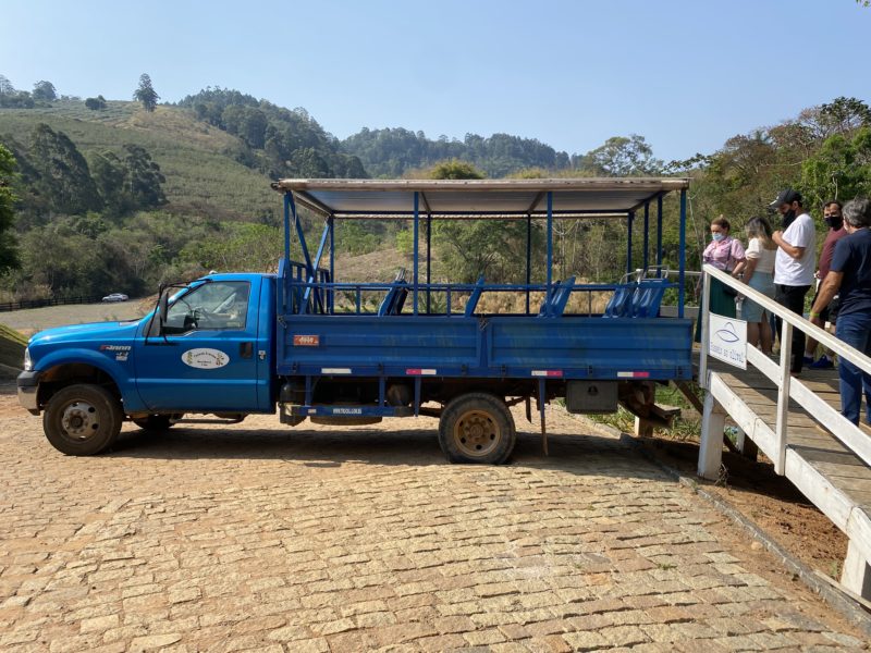 A parte seguinte do passeio foi feita neste caminhão azul com bancos na parte traseira. Percorremos a fazenda passando pelos campos de oliva até chegar no Mirante, que é o ponto mais alto da Fazenda, com 1.500 metros de altitude. Gostei muito da estrutura que eles fizeram com essa rampa de acesso na base e depois a mesma rampa no alto da montanha, no mirante.