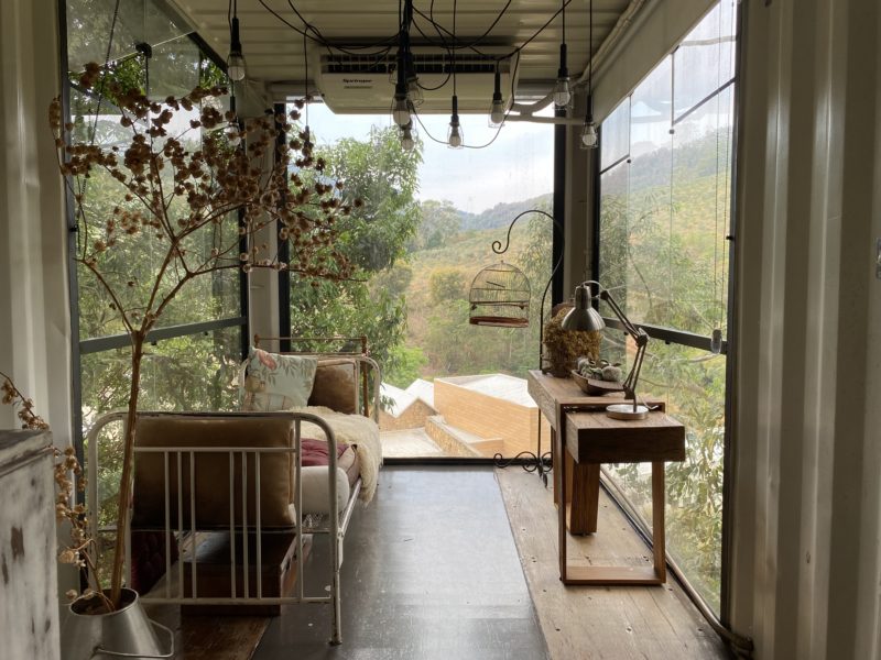 Mas basicamente a loja fica em uma estrutura moderna acima da loja de azeites e brunch. O acesso é feito por um caminho de pedras. No andar de baixo fica a loja toda lindinha e no andar de cima alguns espaços charmosos e mesas na área externa.