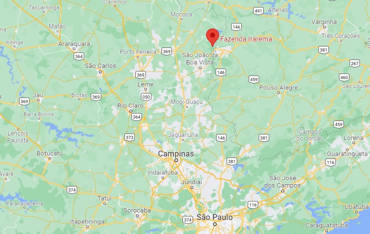 A Fazenda Irarema fica localizada fica em Poços de Caldas e em São Sebastião da Grama, cobrindo uma área de de 550 hectares. O interessante é que cada uma dessa cidades fica em um estado diferente, Poços de Caldas fica em Minas Gerais e São Sebastião da Grama fica em São Paulo.