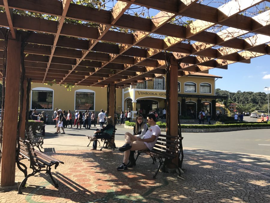Depois partimos para explorar o Roteiro do Vinho. De carro, fomos até a Vinícola Góes, uma das principais da região, na área externa há um restaurante, um lago com um pequena ponte e um extenso gramado.