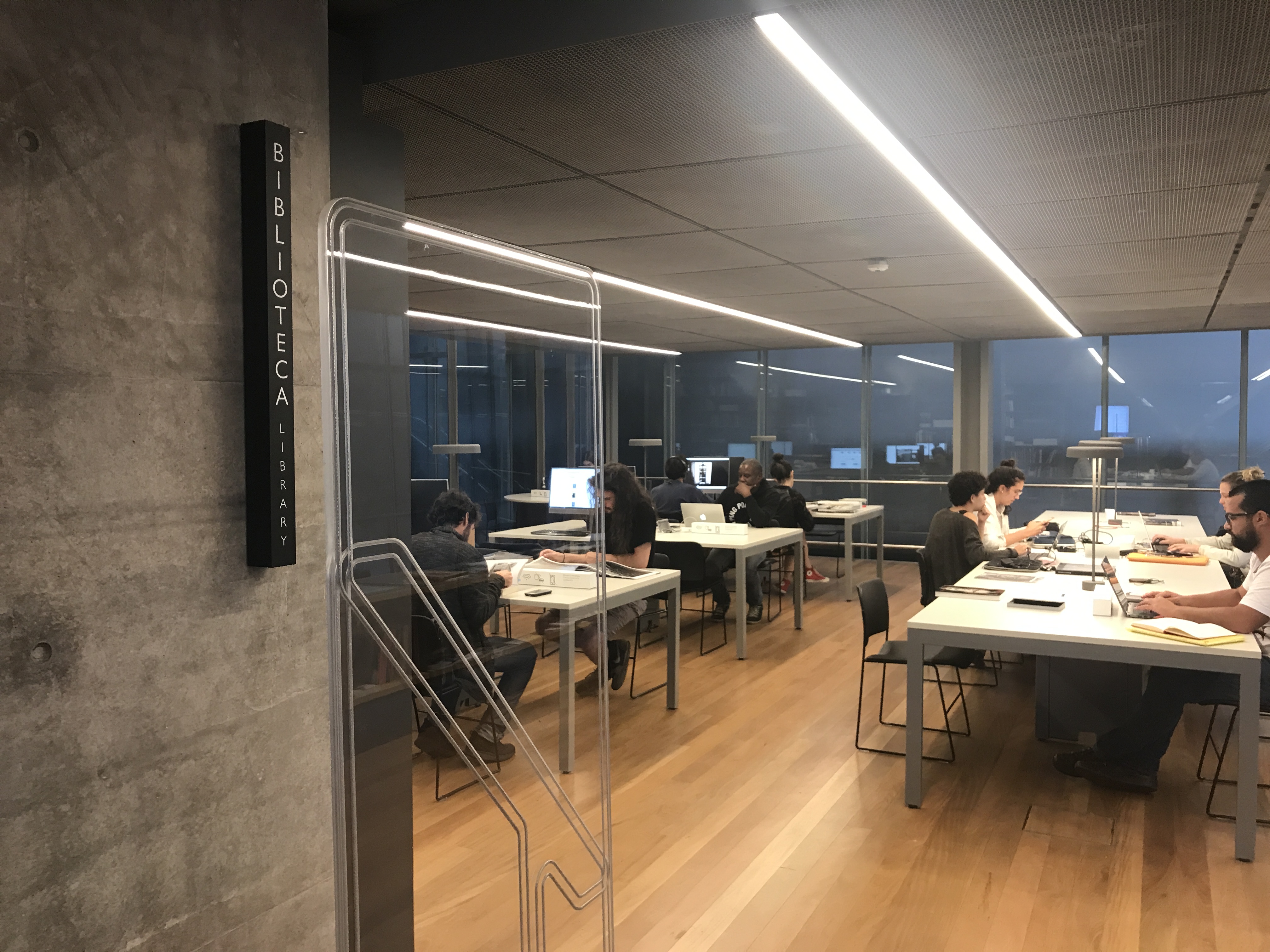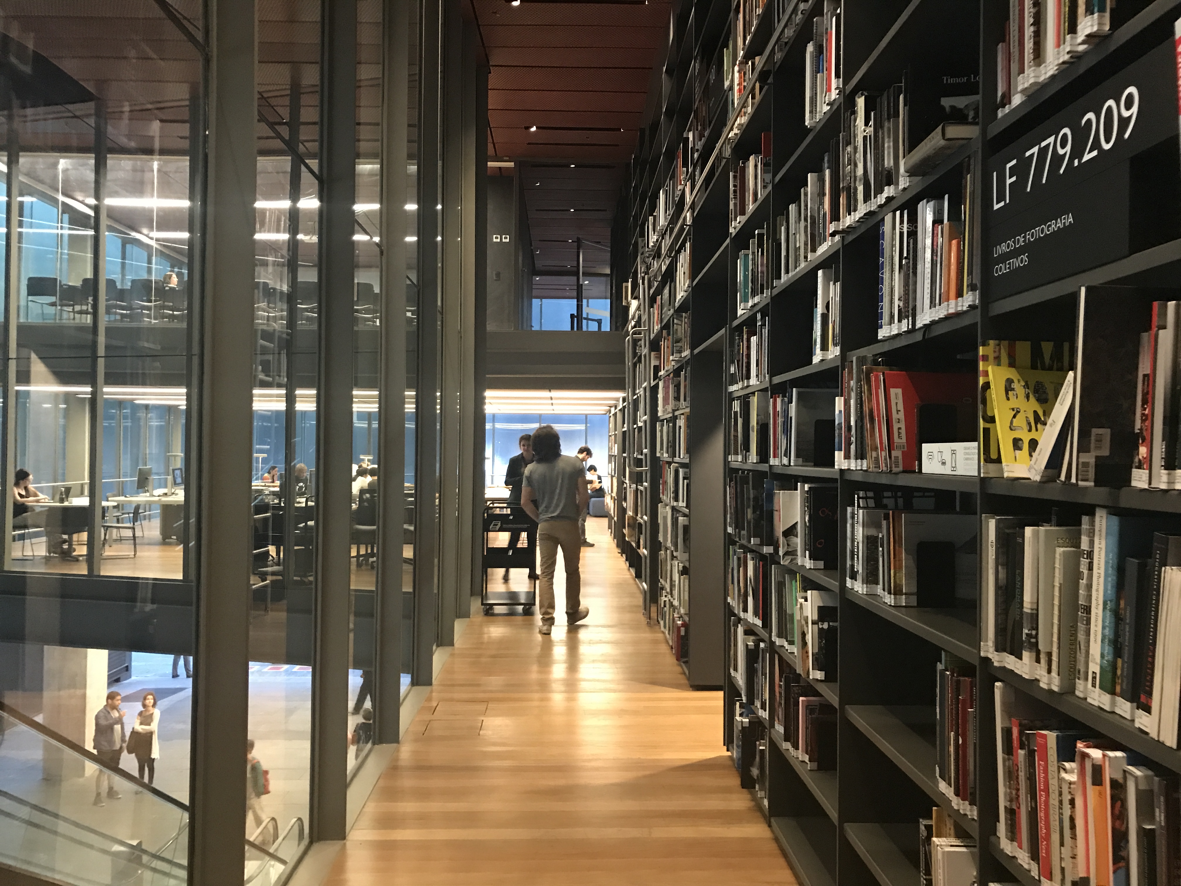 A partir deste saguão, é possível ter acesso aos andares inferiores e aos andares superiores. Os inferiores são: Banheiros, Cine Teatro, Sala de Aula e Biblioteca. Na Biblioteca, há mesas coletivas com tomadas e luminárias, uma longa parede com um acervo de livros de fotografia e cinema. A atendente me informou que os livros podem ser lidos no local, mas não são emprestados para que as pessoas levem para casa e devolvam dias depois.