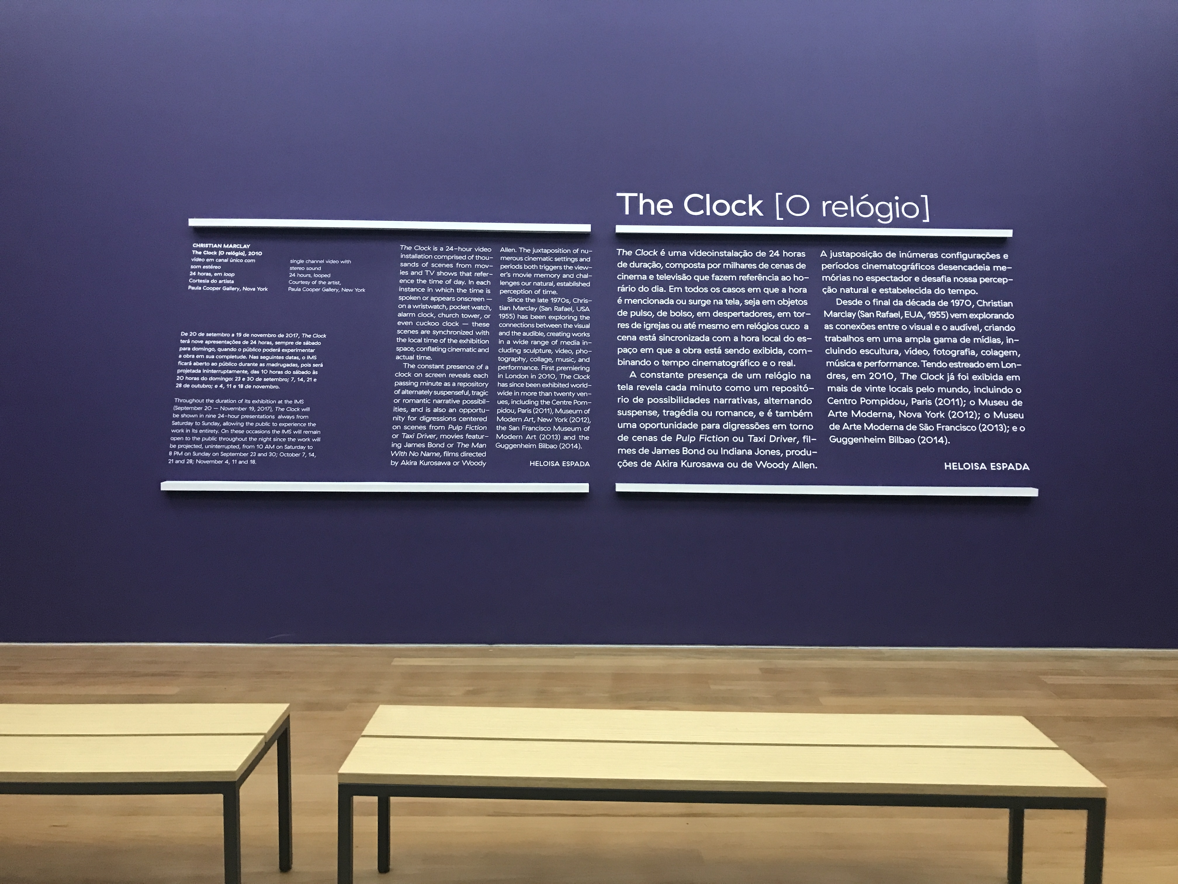 A famosa videoinstalação, “The Clock” estava situada da Galeria 1. Em uma primeira sala havia uma breve explicação sore o funcionamento e na outra sala haviam poltronas e um filme rodando. A duração do vídeo é de 24 horas e nele há fragmentos de diversos filmes,  e em cada cena, que dura aproximadamente 30 segundos /1 minuto há uma referência do horário do dia, seja no relógio no pulso, no relógio ao fundo da cena… O horário do vídeo está ajustado com o horário do dia. Então quem assitia, se olhasse para seu relógio, seria exatamente o mesmo horário mostrado na tela.
