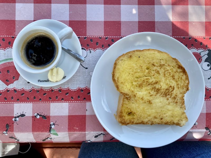 No espaço funciona um café, o Spazio Café que possui um cardápio recheado de comidinhas deliciosas. No dia da minha visita, pedi um pão na chapa (que é produzido na Fazenda) com manteiga e um café expresso.