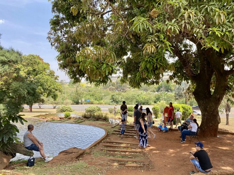 É possível curtir a a natureza e o ambiente agradável embaixo da sombra das mangueiras, em algum dos bancos espalhados pela praça ou até mesmo estender uma toalha e fazer um piquenique. A praça funciona como uma grande rotatória para essa região da pequena cidade de Holambra.