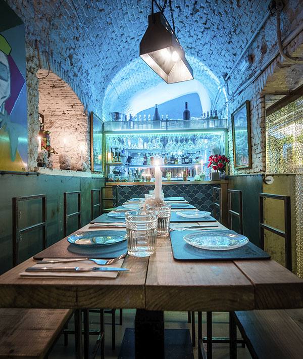 A área interna do restaurante é decorada com luzinhas coloridas, e um espaço com areia e bancos baixinhos, fazendo uma vibe praia. A parte externa, fica por conta das mesinhas na Praça Juan Pujol, que dividem espaço com mesas de outros restaurantes e um parquinho infantil.