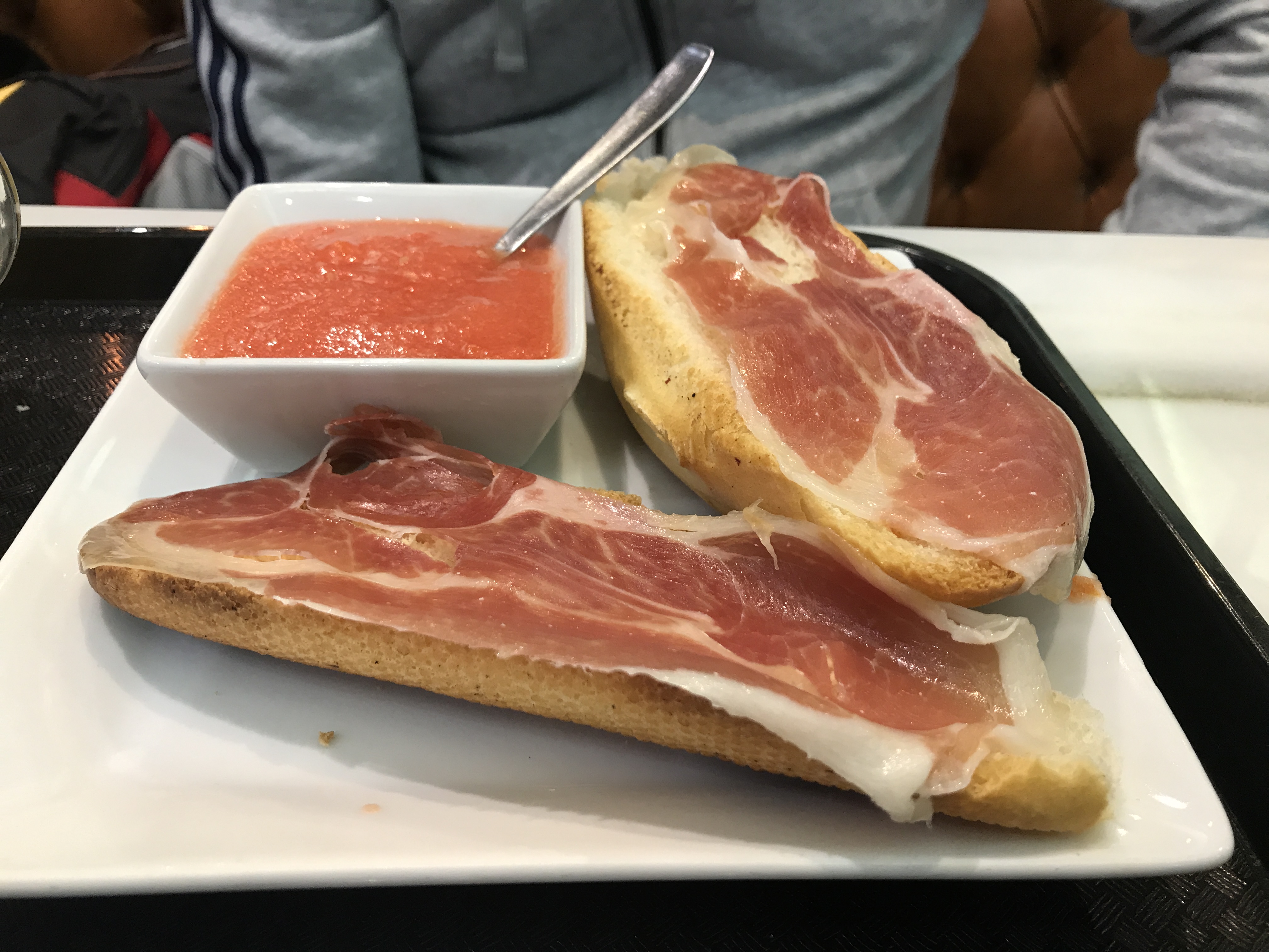 pão com azeite, tomate e jamón serrano I foto: arquivo pessoal Este estabelecimento salvou nosso primeiro dia de viagem. Chegamos no hostal CC Malasanã às 05h30min e os quartos estavam todos ocupados, então foi possível fazer check-in apenas às 12h30min. A Churreria Madrid 1883 fica na mesma rua do CC Malasanã, então entramos para tomar café da manhã, e que experiência boa!