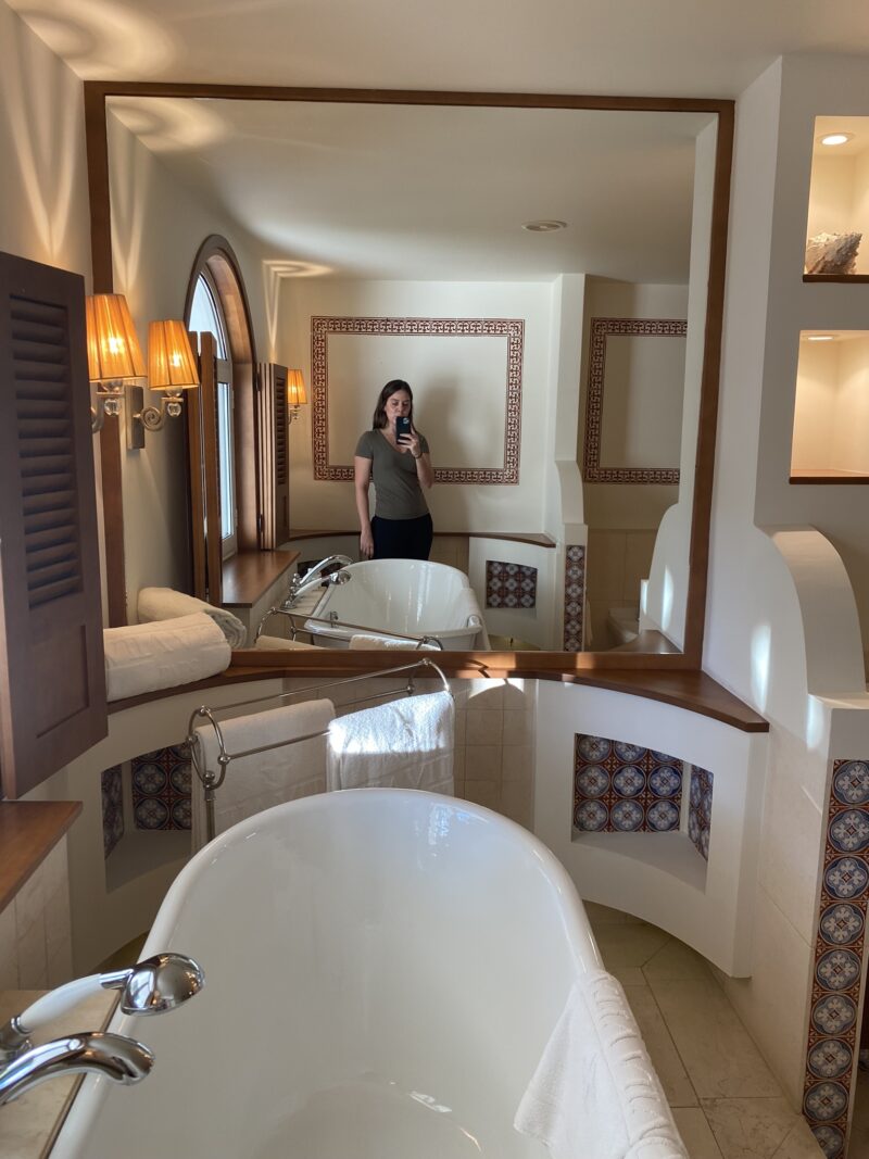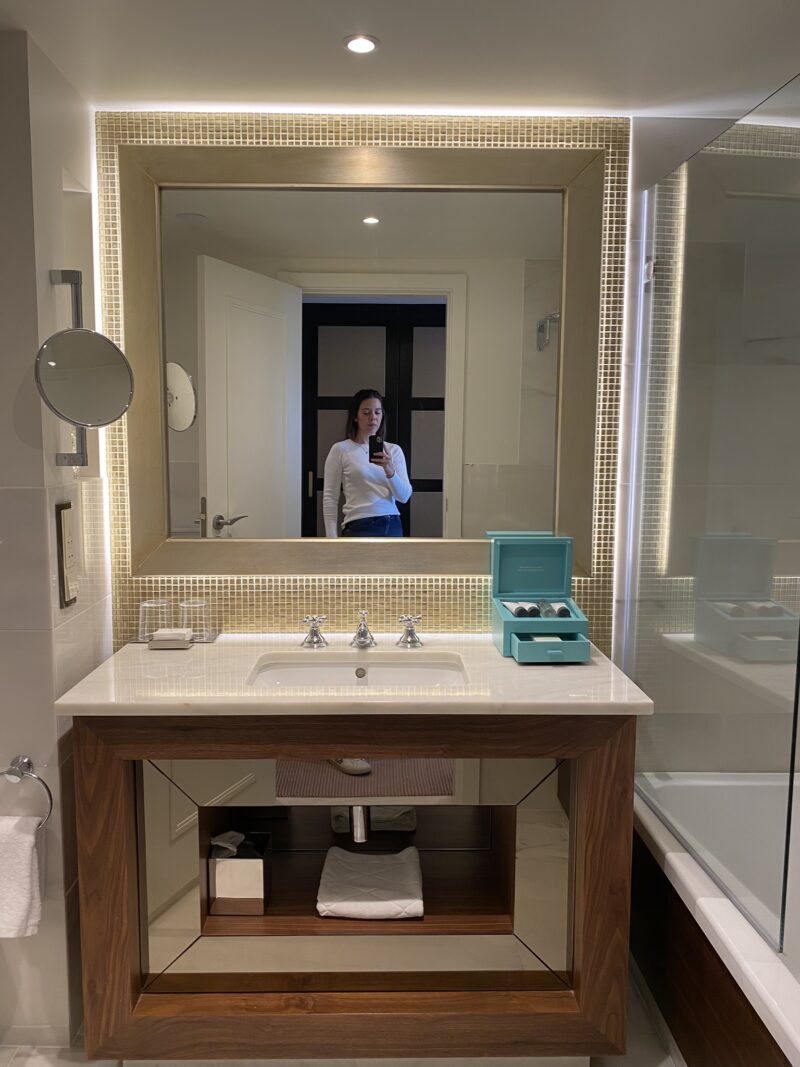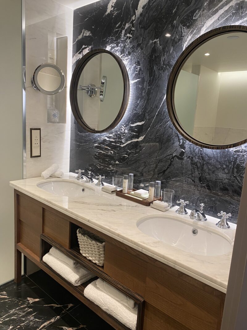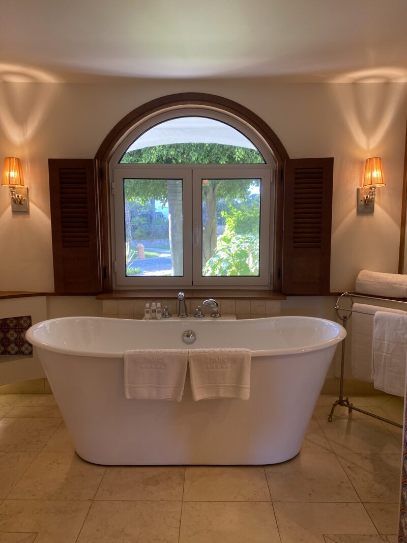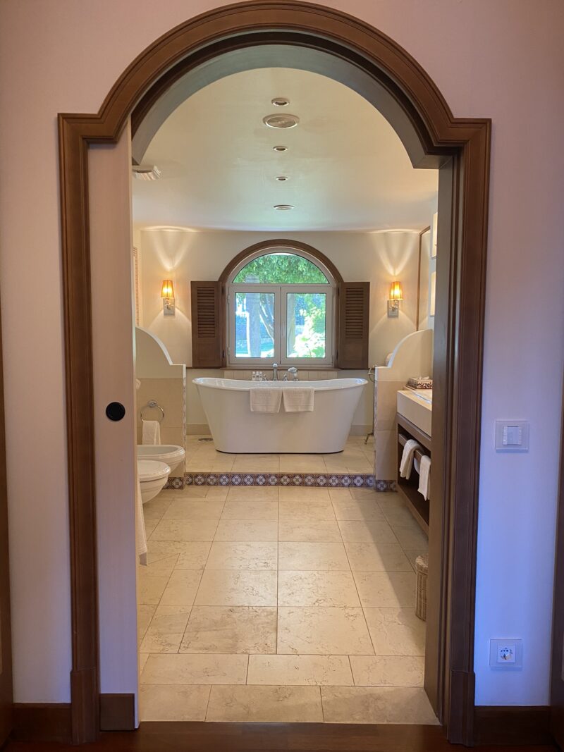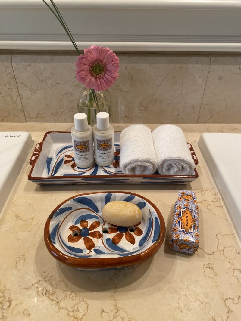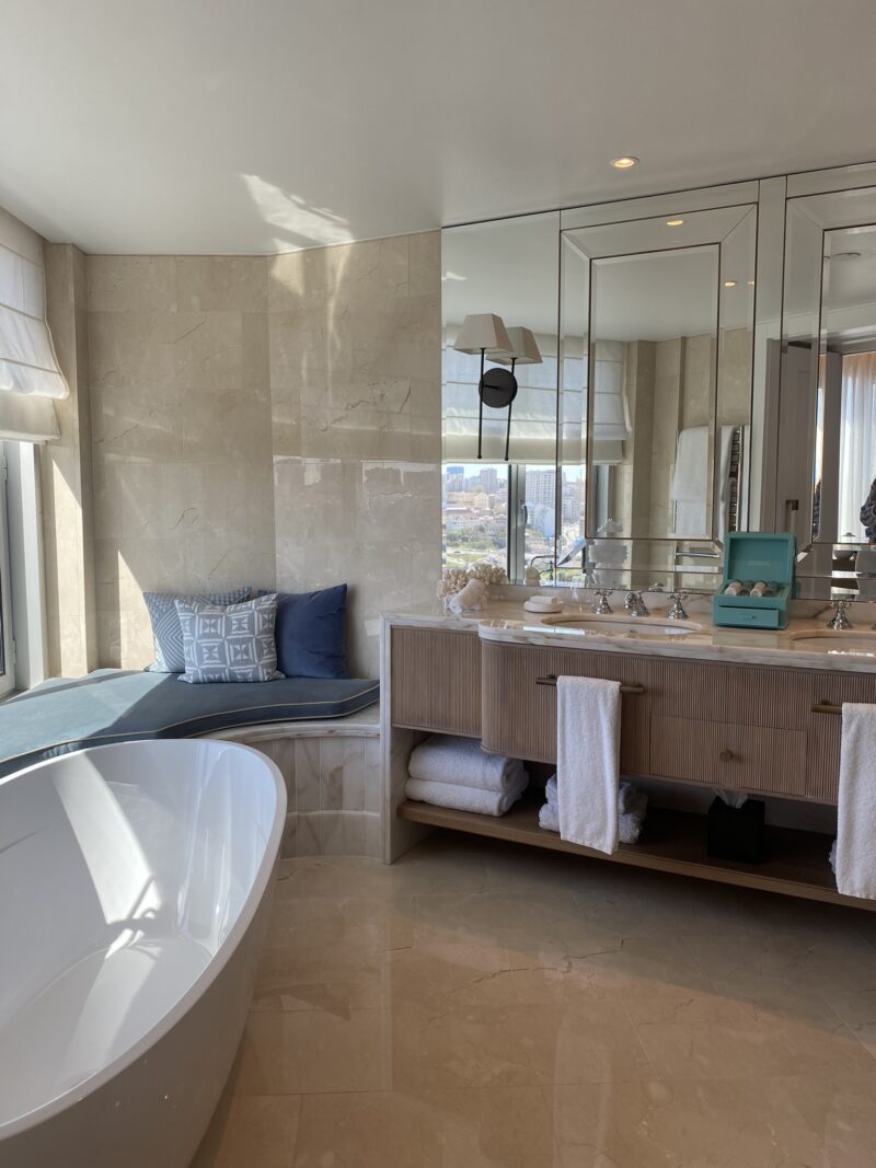 O quarto com 80m2 superou todas as expectativas e o destaque foi para o banheiro, super espaçoso e com uma banheira linda como protagonista. Mas como o luxo está nos detalhes, não posso deixar de mencionar os azulejos portugueses enfeitando o quarto, os deliciosas amenities da Claus Porto.