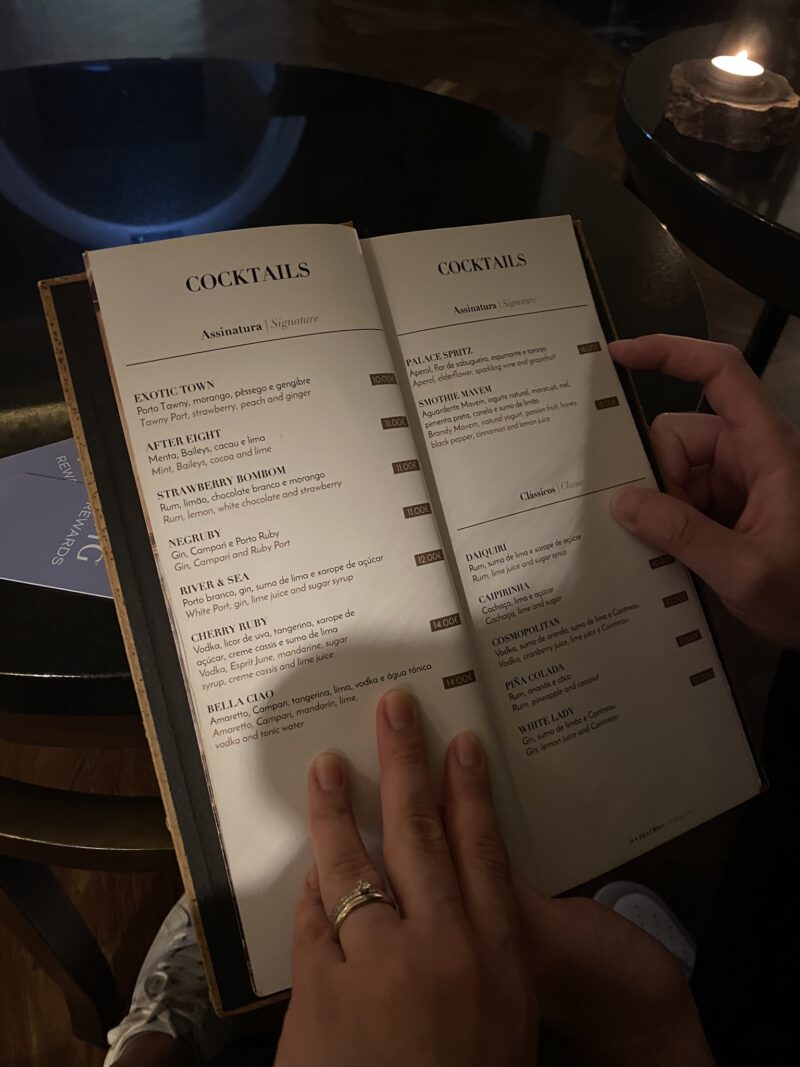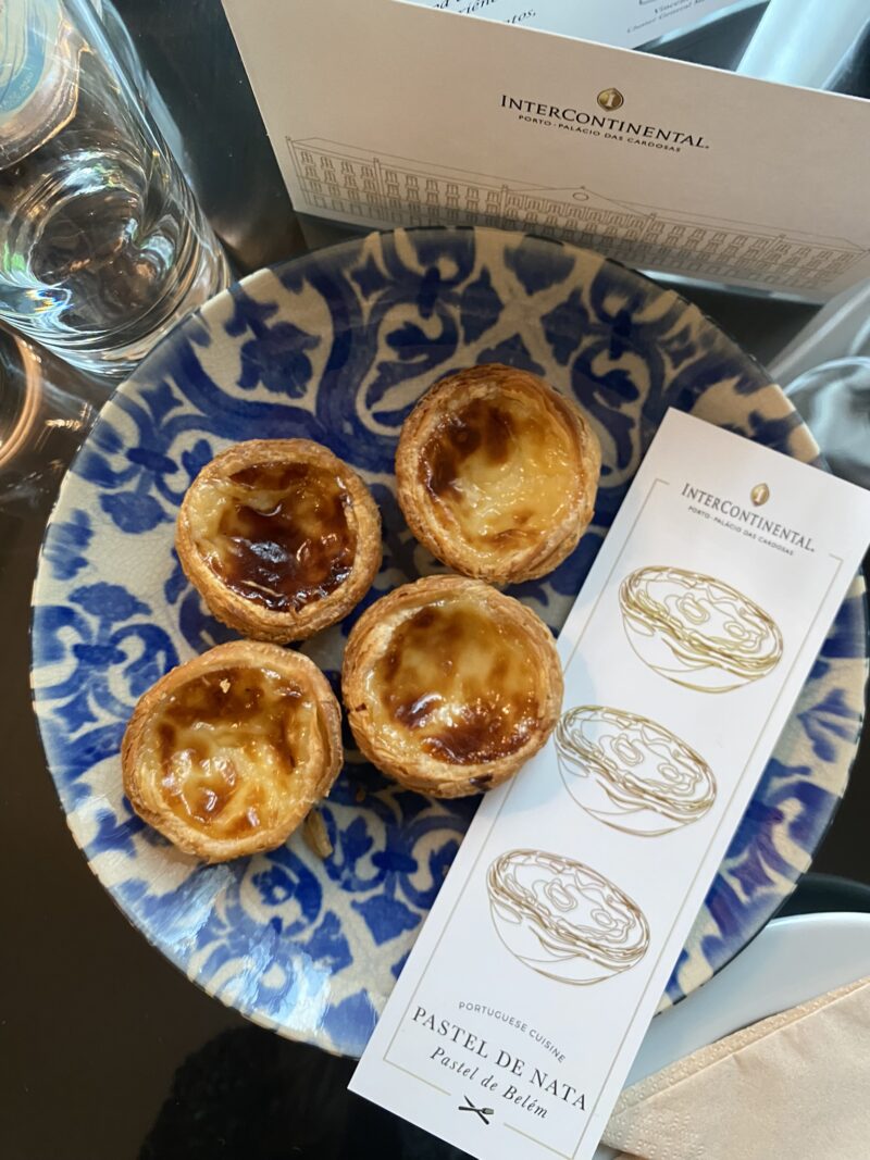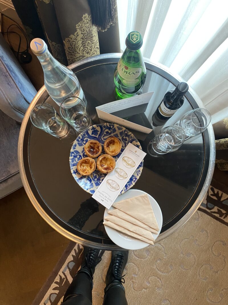 Chegamos no quarto com essa mesa linda com água, vinho do Porto e pastéis de nata. Além desse cartão personalizado que faz toda a diferença na recepção. O quarto é lindo, clássico e espaçoso. O banheiro foi um show a parte, todo revestido de mármore.