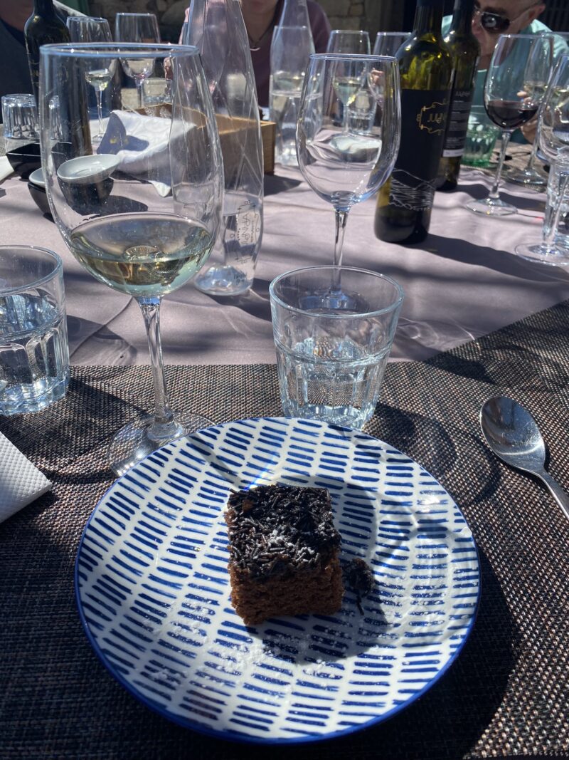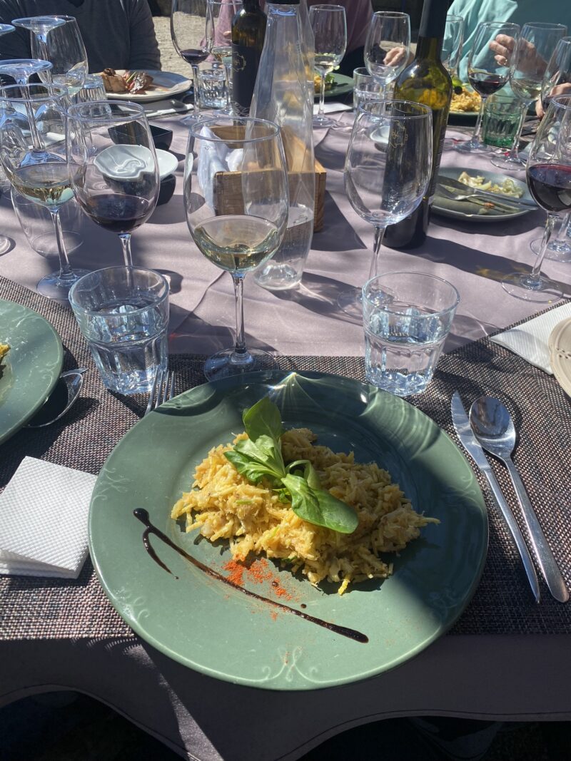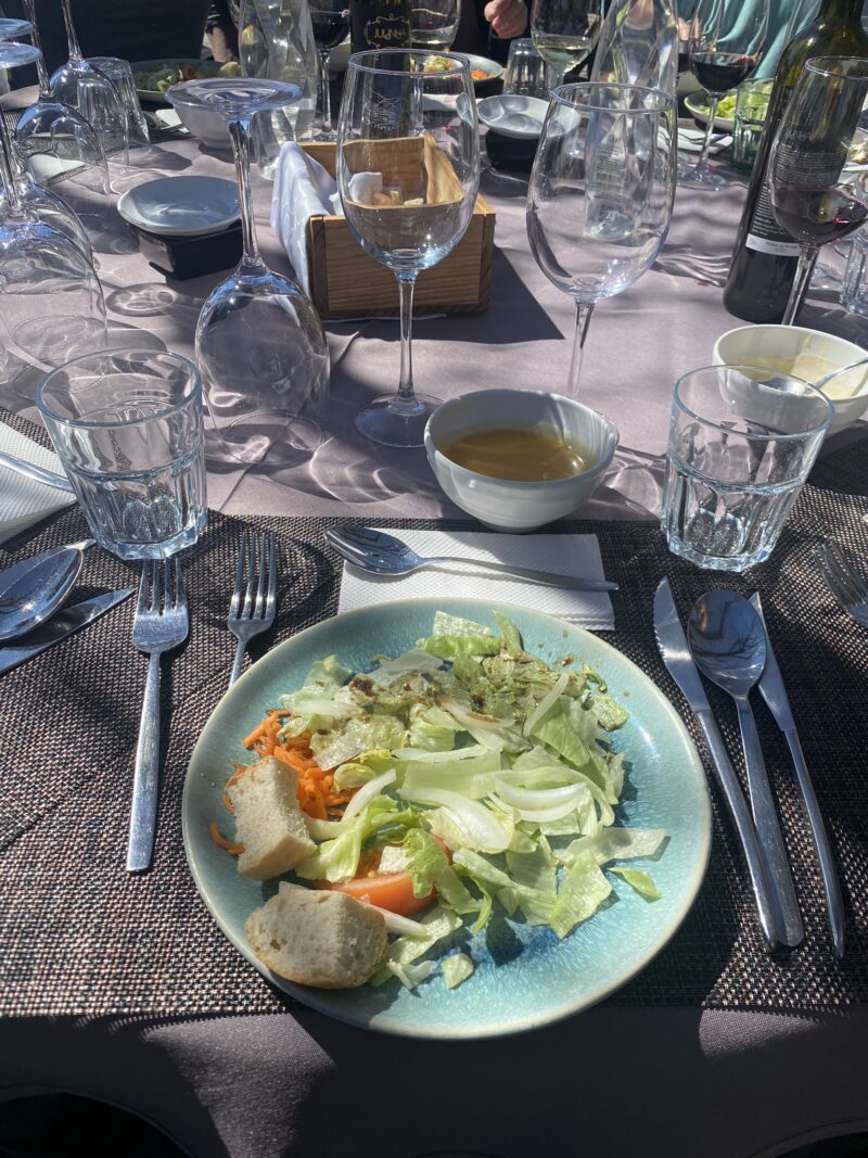 Fomos direcionados para algumas mesas reservadas para o tour e logo já serviram as bebidas, que incluía vinho e outras opções. Ainda dentro do ônibus, antes de chegar aqui, já escolhemos uma entre as duas opções de prato principal. E assim, o almoço foi servido de forma bastante ágil, mas sem correria e pressa.